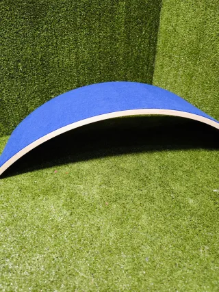 Tabla de equilibrio con un diseño curvo y una superficie de color azul. - Superficie de fieltro azul. - Base de madera. - 92cm largo - 29cm ancho - 2cm grosor