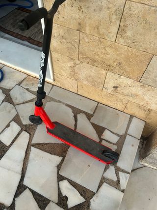Patinete scooter con manillar negro y base roja. - Manillar negro. - Base de color rojo. - Ruedas negras.