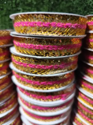 Rollos de cinta de encaje con detalles dorados y un vibrante color fucsia. Perfectas para añadir un toque decorativo a tus proyectos. - Diseño de encaje con hilo dorado. - Tono fucsia llamativo. - Varios rollos apilados.