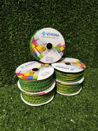 Rollo de cinta de encaje de la marca Viyona. - Color: verde y dorado. - Material: 100% poliéster. - Ancho: 8 mm. - Longitud: 5 metros. - Fabricado en India.