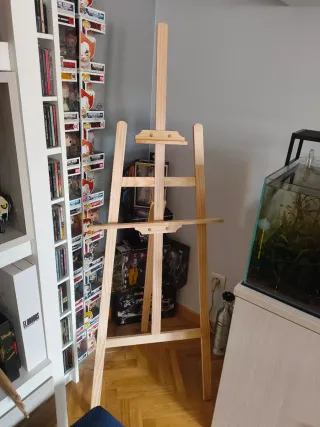 Caballete de madera de 148 cm de altura, incluye todos los tornillos y piezas y manual de montaje. La base se puede subir y bajar según las necesidades. Usado una vez para una presentación escolar y ya no lo necesito - Material: Madera. - Altura: 148 cm. -Anchura: 52cm. Precio original 30€