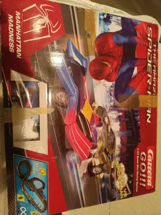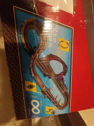Circuito de Scalextric con temática de Spiderman. La pista tiene una longitud total de 5.3 metros. - Pista de 5.3 m (17.38 ft). - Incluye coches y accesorios. - Diseño de circuito en forma de 8.