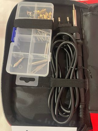 Kit de pirograbado con varios accesorios. A estrenar. Regalo reyes que no usaré Regalo maderas para practicar - Incluye un soldador. - Pinzas de precisión. - Cuchilla. - lija - Repuestos.