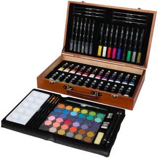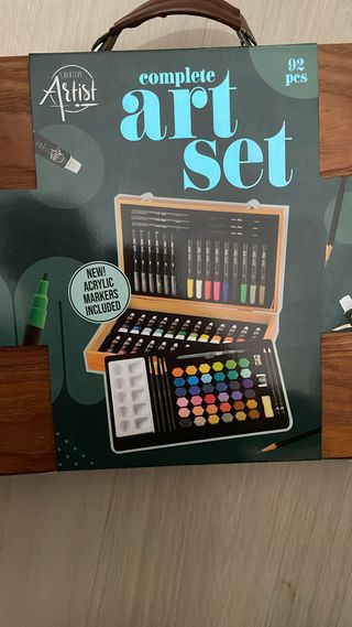 Maletín de madera que contiene una completa caja de pinturas. - Incluye tubos de pintura. - Contiene acuarelas hexagonales. - Incluye pinceles y paleta. Incluye pintura acrílica, marcadores y pinceles Práctico maletín de madera para guardar y transportar Madera con certificación FSC®: madera sostenible. Elegante maletín de madera! Artículo nuevo a estrenar, no devoluciones, sellado.Con nada menos que 92 piezas, entre las que se incluyen pintura acrílica, acuarelas, marcadores, pinceles y lápices; tendrás todo lo necesario para dibujar, pintar y diseñar. Perfecto tanto para principiantes como para artistas
