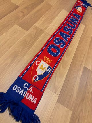 Bufanda de fútbol oficial del Club Atlético Osasuna en excelente estado. Especificaciones técnicas: Tejido de punto acrílico de doble cara (dos capas de tejido). Diseño: Mismo patrón en anverso y reverso con los colores clásicos del club (rojo y azul) y escudos detallados. Estado: Muy buen estado de conservación. Sin signos de desgaste, rotos o pérdida de color. Flecos bien preservados.