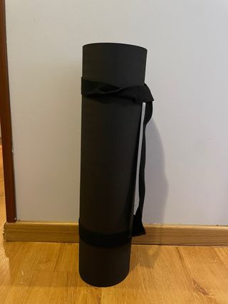 Esterilla de yoga enrollable de color negro. Incluye una correa para facilitar su transporte. - Material: Espuma. - Color: Negro. - Incluye correa de transporte.