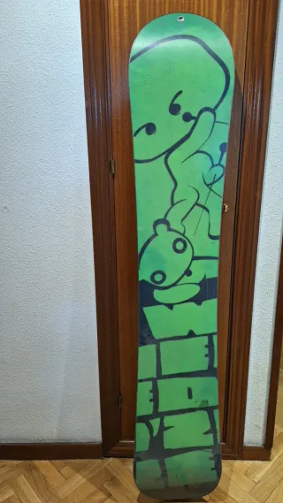 Tabla de snowboard de 160cm con un diseño llamativo en color verde y dibujo. Perfecta para iniciarse en el snow, afilada, le valen fijaciones 4x4, 2x4. - Diseño gráfico con personaje. - Color base verde degradado. - Medida: 160cm. No leer Snowboard 160 tabla iniciacion
