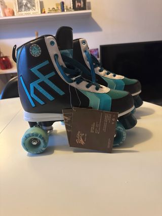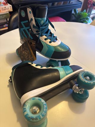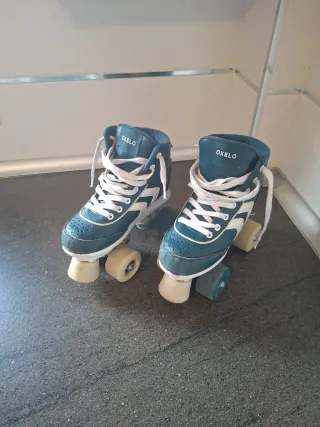 Par de patines de 4 ruedas paralelas de la marca OXELO. Talla 33, azules. - Diseño alto tipo bota. - Cordones blancos. - Detalles en blanco. Ruedas en muy buen estado, con poco uso realmente. Se venden por haberle crecido el pie al niño.