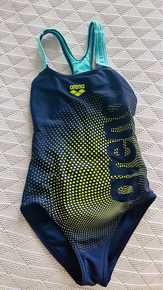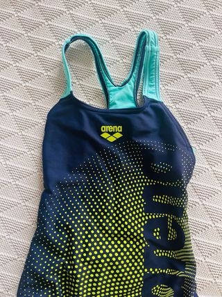 Bañador deportivo de la marca Arena, talla 6 años. Presenta un diseño moderno con degradado de puntos en amarillo neón sobre fondo azul marino. - Diseño con degradado de puntos. - Tirantes cruzados en la espalda. - Logo de Arena en la parte frontal. Poco uso se nos ha quedado pequeño muy rápido