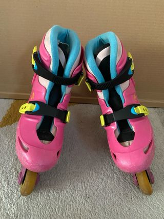 Patines en línea ajustables en color rosa y morado. Marca decathlon, - Talla ajustable de 30 a 32. - Diseño con detalles decorativos. - Cierre de velcro y hebilla.