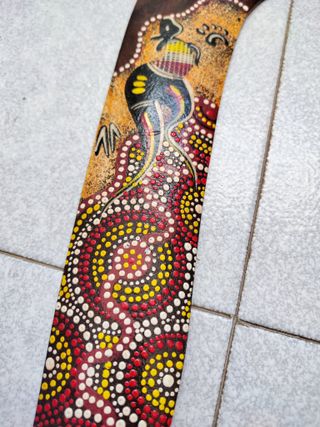 Bumerán decorativo con diseño aborigen australiano. - Pintura artesanal con motivos tradicionales. - Colores vibrantes: rojo, amarillo y blanco. - Diseño detallado con puntos.