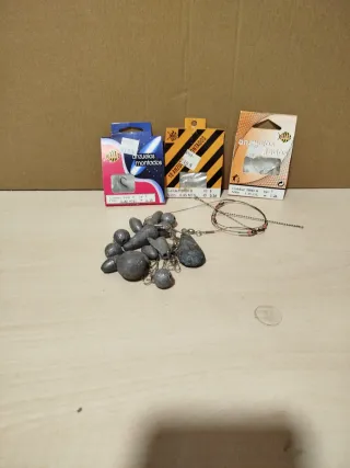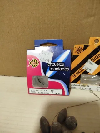 Lote de material de pesca que incluye anzuelos montados y plomos. - Anzuelos montados en caja. - Plomos de pesca de diferentes tamaños y formas. Hay unos 26 anzuelos montados medidas pegueñas