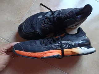 Zapatillas deportivas Adidas para pádel. - Color negro con detalles en gris y naranja. - Cierre de cordones. - Suela con tecnología ADITUFF. Talla 42