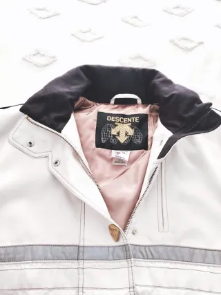 Chaqueta de esquí de la marca Descente en color blanco. _Máxima comodidad, resistente al agua, sistema de ventilación, faldón para nieve. - Diseño con detalles en negro y gris( reflectante ). - Cierre doble de cremallera y botones frontal. - Bolsillos exteriores y otro en su interior.