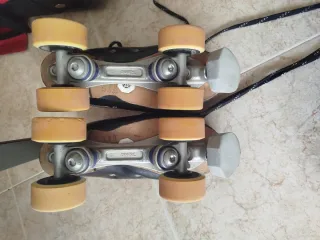 Patines de hockey marca Reno en talla 42. Diseñados para un buen rendimiento en la pista. - Ruedas de color amarillo. - Cierre con cordones. - Base metálica. - Freno delantero.