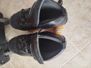 Par de patines de ruedas negros con correas ajustables. - Diseño con cuatro ruedas por patín. - Cierre de velcro y hebilla. - Estructura de plástico resistente.nuevos