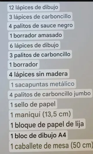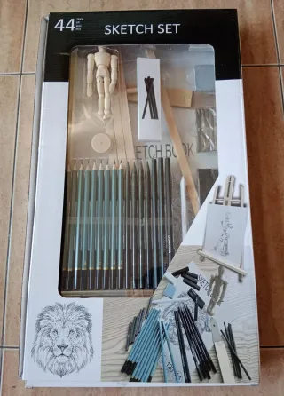 Set de dibujo completo con 44 piezas para artistas. - Incluye lápices de grafito y carboncillo. - Incluye muñeco de madera articulado. - Incluye mini caballete y lienzo. - Incluye goma de borrar y sacapuntas.
