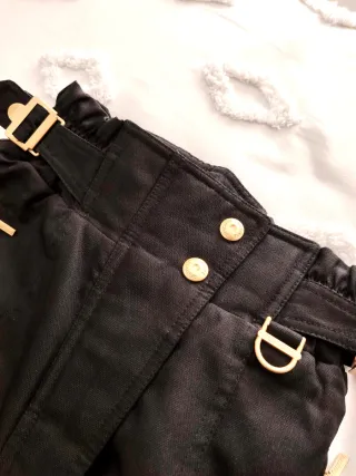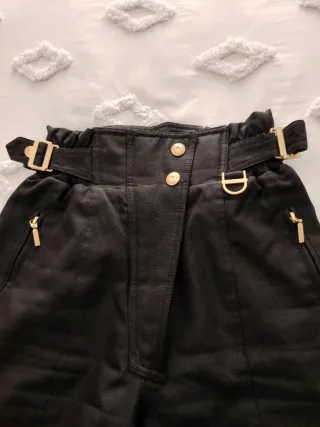 Pantalones de esquí negros con detalles dorados y cintura alta. - Cintura alta con cinturón ajustable. - Dos botones dorados en la parte frontal. - Cremalleras doradas en los bolsillos laterales.