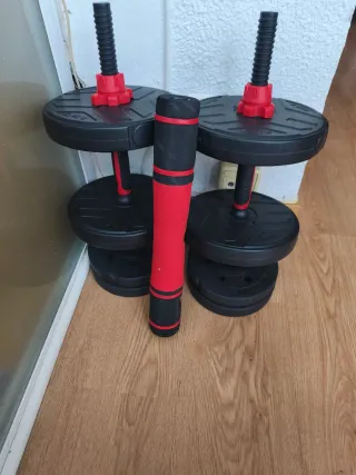 PRECIO NEGOCIABLE. Set de mancuernas ajustables de 10 kg ideal para entrenar en casa. Permite configurar diferentes pesos y usarlo tanto como dos mancuernas independientes o unirlas para formar una barra larga, ampliando los ejercicios posibles. Contenido del pack: 4 discos de 1,25 kg 4 discos de 1 kg 2 barras para mancuernas 1 barra extensora para convertirlas en barra larga 4 conectores/tuercas de seguridad para fijar los discos El sistema es ajustable, por lo que puedes añadir o quitar discos fácilmente según el nivel de entrenamiento. Ideal para trabajar brazos, pecho, hombros y espalda desde casa sin necesidad de gimnasio.