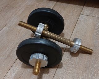 Set de mancuernas ajustables de 10Kg con discos de peso. Incluye los ajustes para que no se muevan los discos. Se puede poner una mancuerna de 18kg.