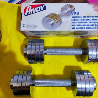 . - Dos Mancuernas Andy de 5 kg, perfecta para hacer ejercicio en casa. - Están fabricadas en acero cromado y son ajustables. - Mancuernas cromadas, en excelentes condiciones. - Peso por unidad: 5 kg. - Ideales para entrenar en casa. -Precio por las dos unidades - Material: Cromado. - Diseño ajustable.