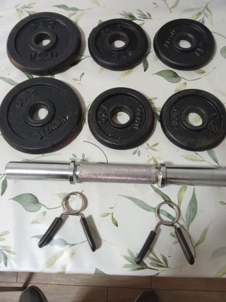 Barra transformable en mancuernas, con almohadilla y pesas (hasta 20kg). Buen material, rígido y duradero.