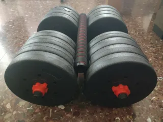 Set de mancuernas ajustables con barra de conexión (para hacer una sola pesa) y caja de almacenamiento. Permiten distintas configuraciones de peso hasta 20 kg. Como nuevas, poquísimo uso. - Dos mancuernas ajustables. - Barra para unir mancuernas. - Discos de peso. - Caja de transporte. Se entregan en Valencia, zona Torrefiel.