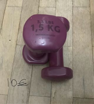 mancuernas cromadas con agarre texturizado Las hay de diferentes pesos y las blancas el peso está en libras. La mancuerna con discos 40€ La mancuerna gris de 10 kg 20€ Los discos sueltos de 4 y 1,5 (10€ y 5€ respectivamente) Las blancas 10€ - Mango antideslizante para un mejor agarre.