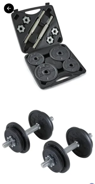 Kit de mancuernas DOMYOS de Decathlon. - Peso total: 20 kg - Incluye 2 mancuernas. - Incluye discos de 1 kg y 2 kg. 8 discos de 1 kgs 4 discos de 2 kgs Estoy en belvitge, hospitalet No hago envios No se baja de precio lo siento.