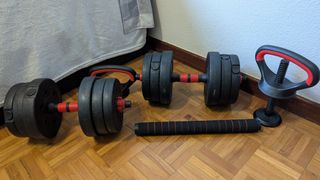 Set de mancuernas del Decathlon sin apenas uso. Se compone de dos barras, 8 pesas de 1kg y 4 pesas de 2kg