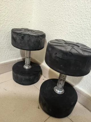 Conjunto de mancuernas de goma con diferentes pesos, ideales para entrenamientos. - Mancuernas con recubrimiento de goma. - 2,5 kg/5 kg/ 7,5 kg/ 10 kg / 12,5 kg / 15 kg/ 17,5 kg/ 20 kg/ 22,5 kg / 25 kg/ 27,5 kg / 30 kg / 32 ,5 kg / 35 kg/ 37,5 kg - las de 32,5 son algo diferentes - vendo kit completo a 1€ el kilo - puedo enviar