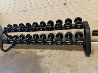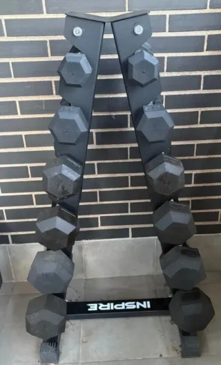 Se vende juego de mancuernas hexagonales nuevas sin abrir con rack. - Incluye 8 pares de mancuernas. - Pesos desde 2.5 kg hasta 20 kg. - Rack de almacenamiento de 3 niveles.