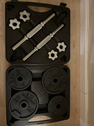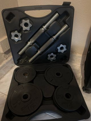 Set de mancuernas con maletín para guardarlas y transportarlas fácilmente. Incluye barras, discos y cierres. - Dos barras de mancuerna (2kg). - Cuatro discos de 2kg. - 8 discos de 1kg. - Cuatro cierres de estrella. Me las compré en 2021 en Decathlon para hacer deporte en casa, las vendo porque me mudo y no me las llevo. No envío porque no merece la pena con lo que pesan