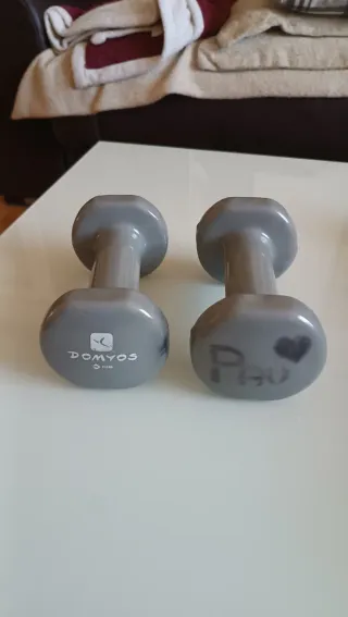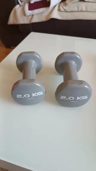 Par de mancuernas de 2 kg cada una, perfectas para entrenamientos en casa o gimnasio. - Peso: 2,0 KG (4,4 LBS) por mancuerna. - Marca: Domyos (Decathlon). - Diseño hexagonal para evitar que rueden.