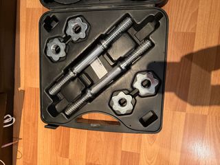Set de pesas ajustables para entrenar en casa. Incluye barras, discos y cierres. - Dos barras de pesas. - Discos de diferentes pesos. - Cierres de estrella para asegurar los discos. - Maletín de transporte para guardar todo.