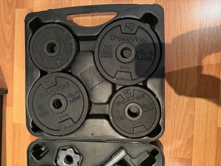 Set de pesas Domyos de Decathlon con maletín. Incluye: • Discos de peso hasta 20 kg + 4 discos de 2 kg extra de regalo • 2 barras de mancuernas roscadas • 4 cierres de seguridad • Maletín original para transporte y almacenaje