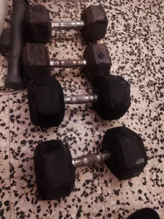 Se vende pack de mancuernas hexagonales con recubrimiento de goma y agarre con moleteado en muy buen estado. Ideal tanto para entrenar en casa como para añadir a un gimnasio. Formado por: - 2 x 10 kg - 2 x 15 kg - 2 x 20 kg - 2 x 25 kg - 2 x 30 kg - 2 x 40 kg