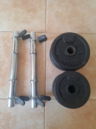 Kit de mancuernas compuesto por dos barras con su anilla de seguridad, cuatro discos de 2kg y ocho discos de 1kg.