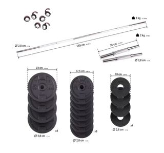 Kit de pesas para musculación con discos de hierro. - Barra de 155 cm. - Dos mancuernas de 35 cm. - Discos de 2,8 cm de diámetro. - Incluye 4 discos de 23 cm. - Incluye 8 discos de 17,5 cm. - Incluye 4 discos de 10 cm. - Incluye 2 kg de peso adicional.