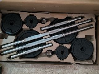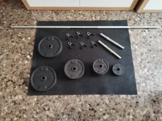 Conjunto de equipamiento para entrenamiento de fuerza en casa. Esta comoletamente nuevo y en dechatlon lo venden por 135€. - Barra de 155 cm. - Dos mancuernas de 35 cm. - Discos de 5 kg (x4). - Discos de 2,5 kg (x8). - Discos de 1 kg (x4). - Cierres para barra y mancuernas.