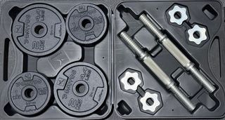 Kit de mancuernas Domyos de Decathlon con un peso total de 20 kg (44 lb). - Incluye 2 barras de 35 cm. - Incluye 4 discos de 1 kg (2.2 lb). - Incluye 8 discos de 2 kg (4.4 lb). - Viene en un maletín de transporte.