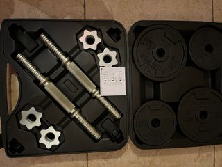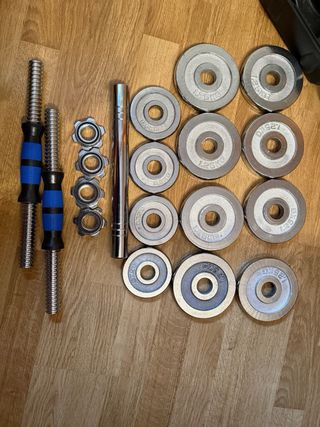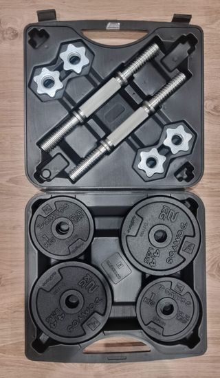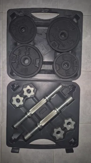 Set de mancuernas ajustables de la marca Domyos, ideal para entrenamientos en casa. Incluye estuche para guardarlas. SET 1 (con estuche) 35€ individual. - 2 barras de mancuerna. - 8 discos de 1 kg. - 4 discos de 2.2 kg (4.4 lbs). - 4 cierres de estrella. SET 2 (sin estuche) 95€ individual - 2 barras de mancuerna - 2 discos de 10 kg. - 4 cierres de estrella. Ambos SET 110€.