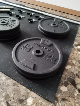 Conjunto de equipamiento para entrenamiento en casa. - Mancuernas hexagonales de goma. - Mancuernas redondas. - Discos de pesas. - Barra de pesas. Todo completo 650€ Por separado -5kg. 25€ -7,5----35€ -10-----45€ -12,5----60€ -15------65€ -17,5----70€ -20-----75€ -22,5---75€ -25-----80€ Disco de 5kg----30€ el juego Discos de 10kg--50€ el juego Barra de 30kg ---60€