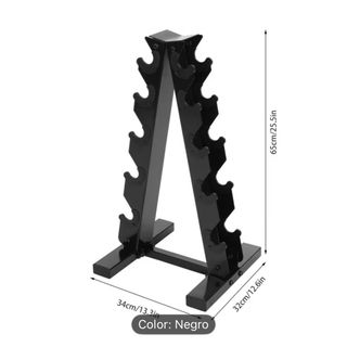 Soporte con 10 espacios dedicados para guardar 5 pares de mancuernas. Con inserciones de plástico para evitar dañar las mancuernas. Carga máxima de 100 kg, montaje necesario. De acero, acabado en color negro. Medidas totales: 35 cm de ancho x 66 cm de alto x 33 cm de fondo. Sin usar. Se envía.