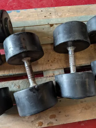 Se venden mancuernas de gimnasio con pesos que van desde 17,5 kg hasta 37,5 kg. El precio es de 2€ por kilogramo. - Pesos disponibles: 17,5 kg, 20 kg, 22,5 kg, 25 kg, 27,5 kg, 30 kg, 32,5 kg, 35 kg, 37,5 kg. - Ideales para entrenamiento de fuerza.