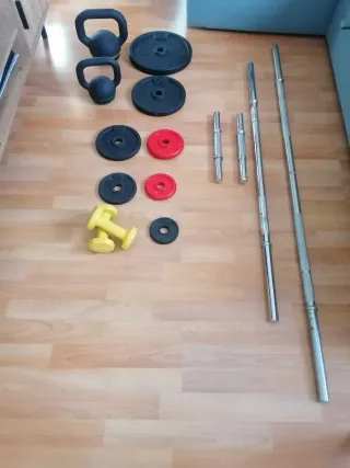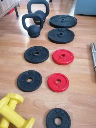 Conjunto de material para entrenamiento en casa. Si lo quieres todo ajustamos precio. Barra 1,55m 22€ Barra 1,20m 22€ Barra mancuernas 35cm 2 unidades 10€/unidad Disco 10kg 2 unidades 20€/unidad Disco 5kg 2 unidades 9€/unidad Disco 2kg 2 unidades 3€/unidad Disco rojo 2kg 2 unidades 3€/unidad Disco 1kg 4 unidades 1,5€/ unidad Disco rojo 1kg 4 unidades 1,5€/ unidad Disco 0,5kg 4 unidades 1€/unidad Mancuernas amarillas 2kg 8€ Ktw 12 kg 30€ Ktw 6kg 12€