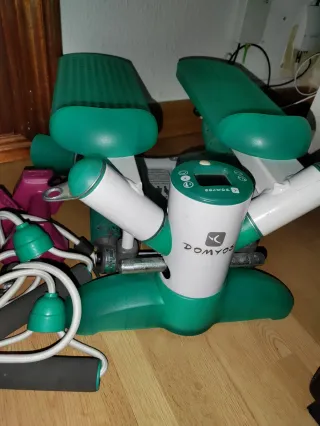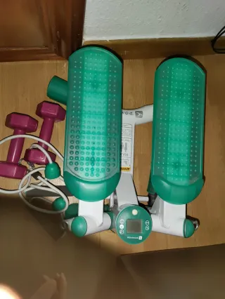 Equipo de ejercicio para casa, ideal para tonificar y mantener la forma. - Stepper con pedales texturizados en color verde. - Pantalla digital para seguimiento de ejercicio. - Incluye dos mancuernas de color morado de 0,5 kilos.