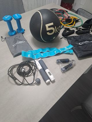 Kit completo para estar en forma en casa, pelota, mancuernas, comba digital, fortalecedor antebrazo, gomas para puerta con accesorios.