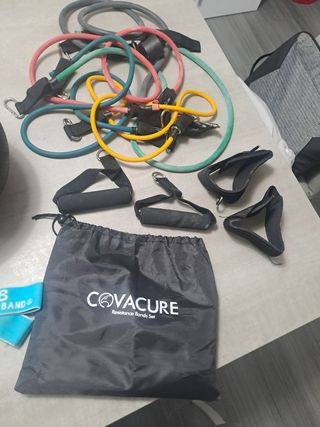Completo kit de entrenamiento para ejercitarse en casa. - Bandas de resistencia azules con asas con todos sus anclajes para poder ponerlo donde quieras. - Mancuernas ajustables de hierro mazizo con 16 discos de 1 kilo. - Rueda de abdominales. - Tabla de ejercicios multi-posición para pecho, espalda, tríceps y hombros. -2 mancuernas pequeñas de 1.5 kilos cada una.