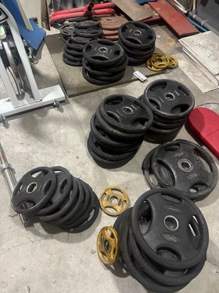 Se venden varios discos y mancuernas de gimnasio usados. Están algo desgastados por el uso, pero en buen estado general. - Incluye aproximadamente 15 discos de diferentes pesos (5kg, 10kg, 20kg). - Unas 12 mancuernas de peso variado. - Ideales para entrenar en casa.